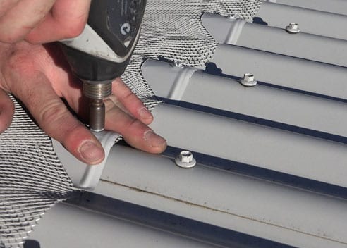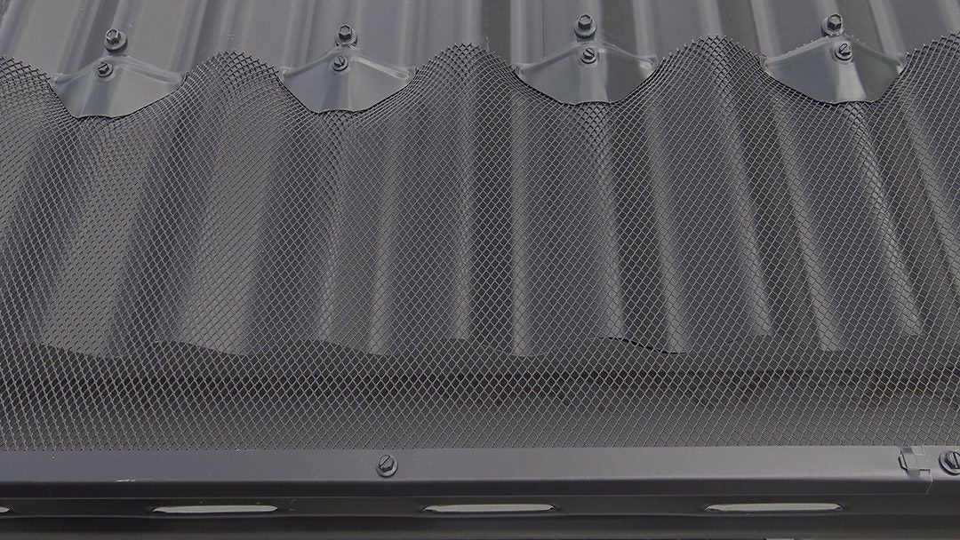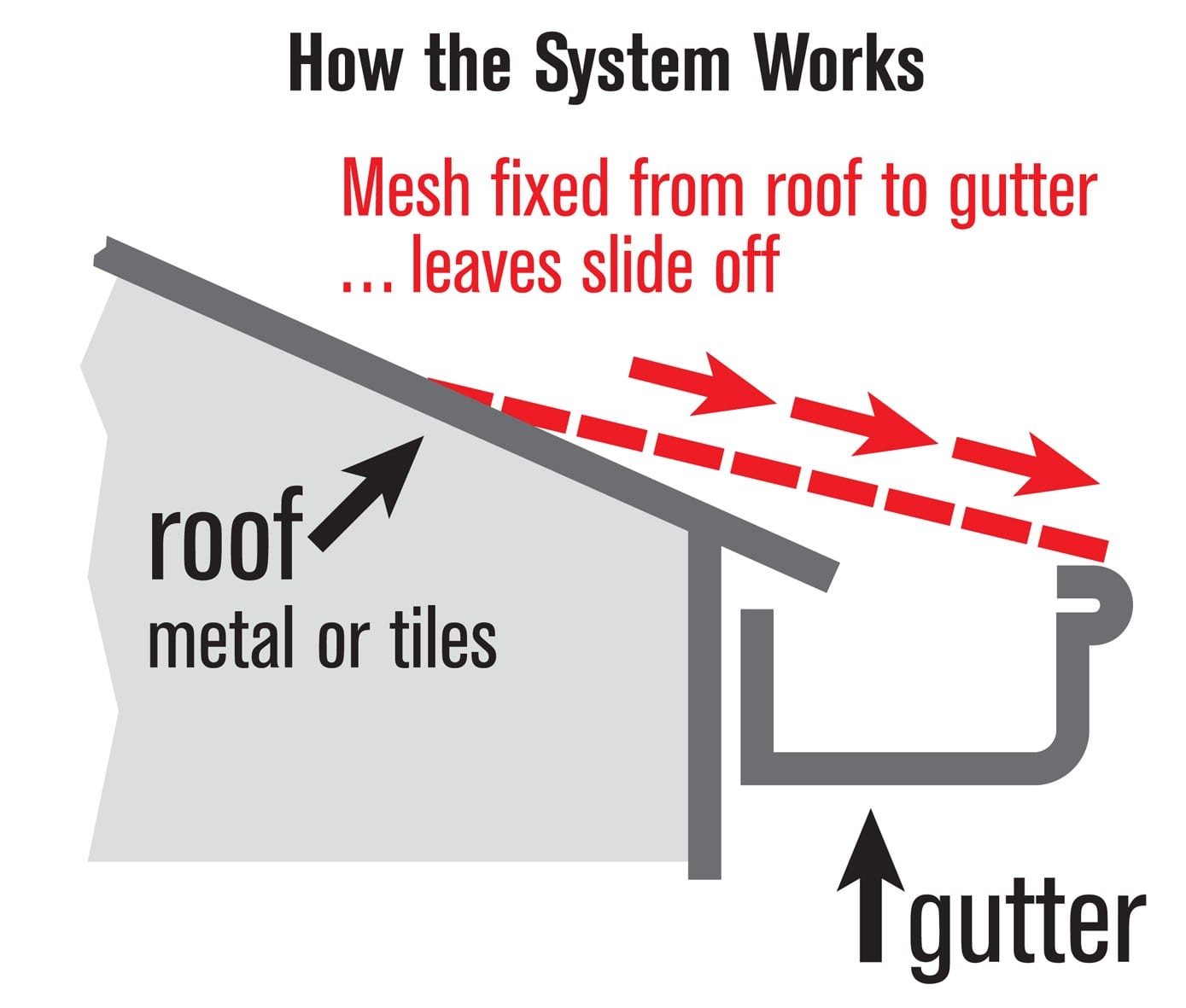 This creates a slope which allows leaves to blow off. In the case of metal roofs, purpose manufactured clips hold the mesh down at the roof end and valleys.